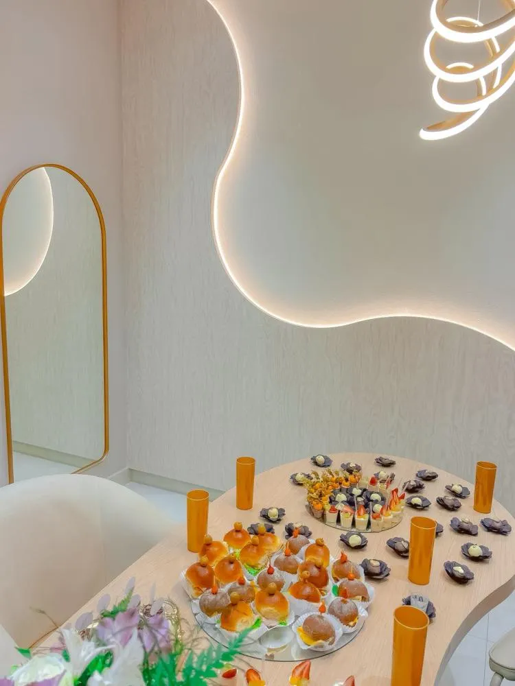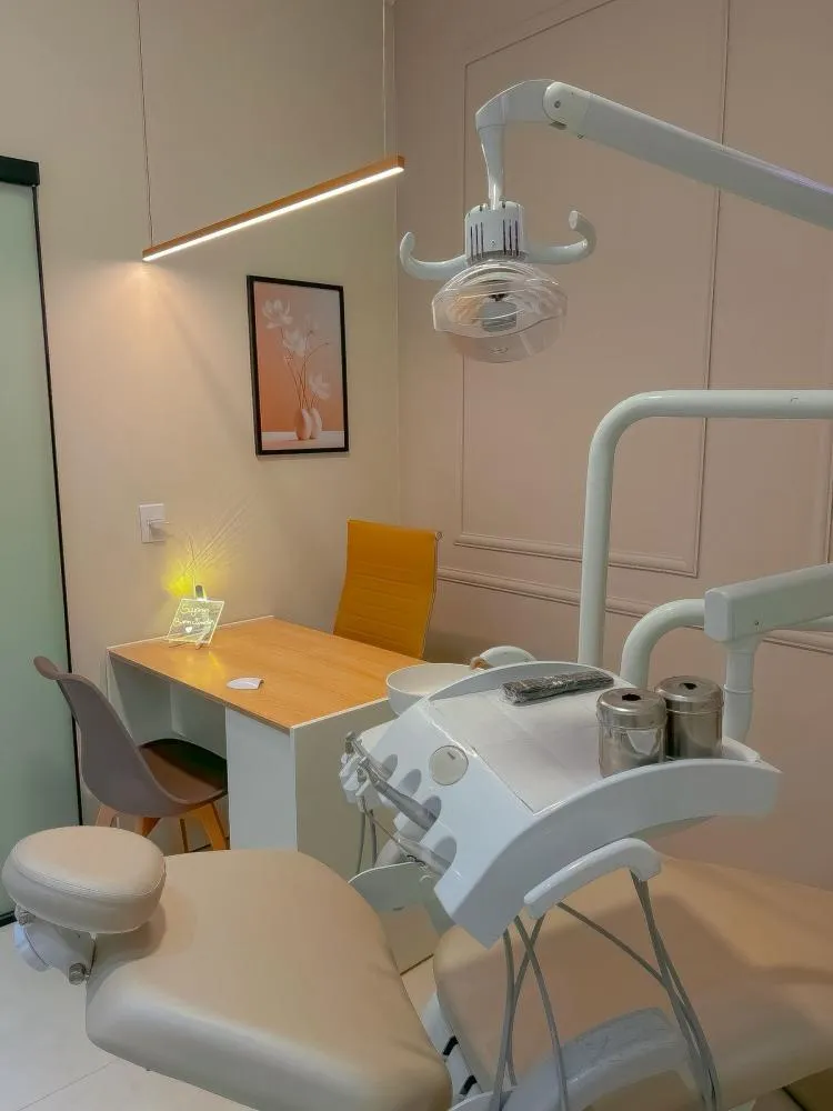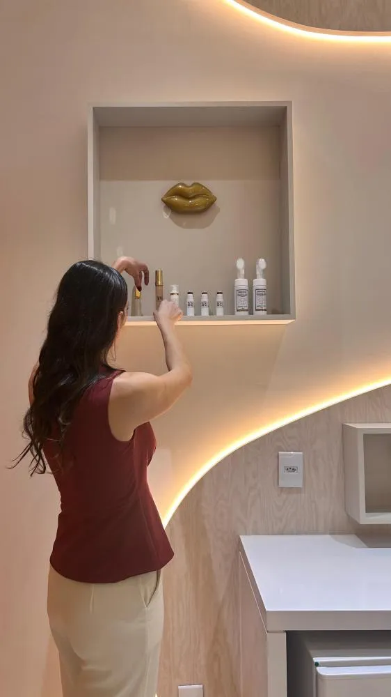 Ao adentrar o consultório, os visitantes foram recepcionados por uma decoração clean, com tonalidades suaves e iluminação indireta que conferem a sensação de tranquilidade — detalhes evidenciados no pendente em formato orgânico e na chapa luminosa atrás da cadeira de atendimento. O mobiliário, em tons madeira clara e bege, contrasta com o toque vibrante da poltrona amarela, transmitindo profissionalismo e acolhimento ao mesmo tempo.